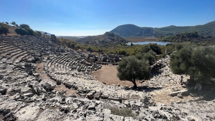 Our visit to the enormous city of Kaunos will be one of the archeological highlights of the trip. Our approach is by boat through a silted-up delta which used to be the port. As we approach, we see an impressive array of tombs carved into the cliffsides, a mixture of monumental Persian tomb carving but with Ionian Greek columnar architectural features suggesting the range of cultural influences in this region. In the city itself, we find all the elements of a prosperous city in antiquity: the theater, the agora, shrines to the Gods, tombs for the elites. There is also an infrequently visited but well-preserved Byzantine church from the late 6th century AD, which offers the chance to discuss the ways in which Christianization affected cities throughout the Byzantine Empire. We often encounter layers and layers of history in each site with the earliest remains reflecting the local Carian people, followed by Greek and Roman monumental structures, and finally Byzantine churches.