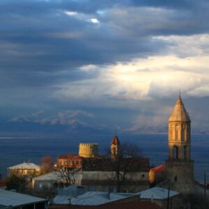 It is one of the most visited sites, most photographed sites, and most beloved sites of Georgians and tourists alike. Once one arrives, it's not difficult to understand why: the 13th stone church stands atop a cliff some 1500 feet above the village of Gergeti, with the majestic 15,500 conical peak of Mount Kazbegi rising directly behind it.