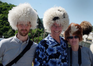 Our tour, called “Silk Roads,” was fantastic. Not only was everything in the itinerary provided, it was all pre-arranged and paid. We guests did not have to worry about any logistics. Our job was just to enjoy ourselves and appreciate this fascinating country. The food was always delicious, the activities very interesting, the countryside beautiful. In the background the snow-covered Caucasus mountains provided constant beauty. But our tour was mostly about hand-on activities: we learned Needle-felting, the properties of jet jewelry-making, the cultivation of tea plants, Georgian cooking, wine tasting from traditional underground clay vessels, the art of the sword-smith, ceramics, and more. In many of the monasteries and ancient churches we visited, John and sometimes others chanted traditional chants connected with Easter, as this was the season. We learned why the older stone churches have better acoustics for the chanters than newer, cement-block churches. We also saw churches from every century from 6th onwards, some with magnificent frescoes. John filled each day with history and culture, so our experiences were surrounded with information. Every day was filled with adventure — it was absolutely wonderful. We met such lovely people, and John himself made us all feel so welcome, and comfortable.