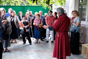 Sioni was the cathedral church of Tbilisi until the recent completion of the Sameba Cathedral in 2004, but it is still the seat of the Georgian Orthodox Church. The Patriarch Ilia II, lives in the adjoining Patriarchal residence. Vespers had not begun at Sioni either, though there was already a sizable crowd. Several of us lit candles and venerated the icons. A woman approached me, raising money for the restoration of a 6th-century monastery in the countryside. I gave her a contribution. A little later on, she came back to me, and asked me my name. I told her and her eyes lit up. “I knew it,” she said. She handed me a small laminated card, with a picture of the monastery on one side, and an icon of St. John the Forerunner on the other. She had a sense that my name was John and she wanted me to have the icon of St. John. She thanked me again, and told me to keep the icon with me always. I have tried to do so. We then walked over to Jvris-Mama Church, where Vespers were underway. The church was more or less packed, mostly with younger people. The crowd were a little noisier than what we are used to, but this seemed to be quite normal for this church. John G. led us to the grotto within the compound, and showed us where he had been baptized a few years back. After a bit, we hiked back over to Anchiskhati Church, where Vespers were finally underway. We edged our way into the crowd, as the nave was fully packed. Interestingly, the men were on the right and the women were on the left. There was no noisiness as in Jvris-Mama. Everyone was quietly and reverently attentive.